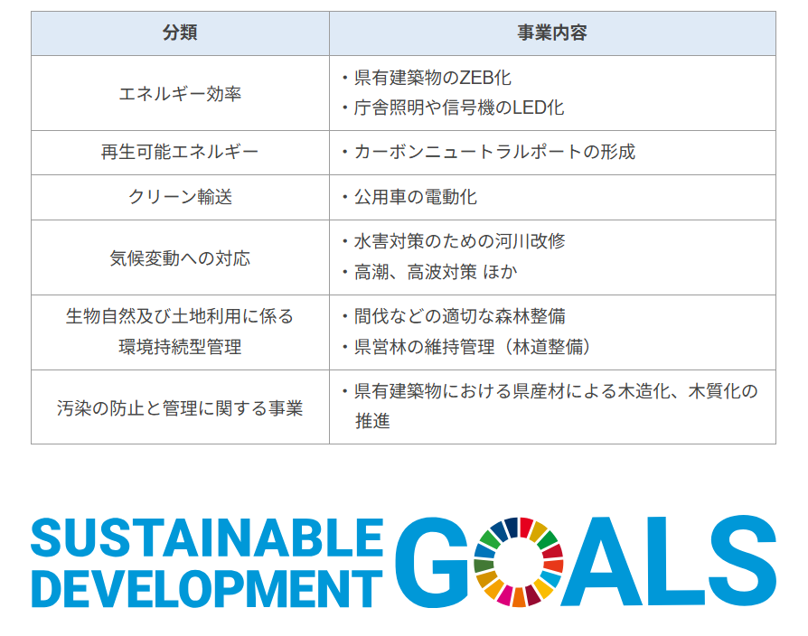 本債券の発行による調達資金は、静岡県が取り組むSDGsの達成に資する下表のグリーン化事業に充当されます。